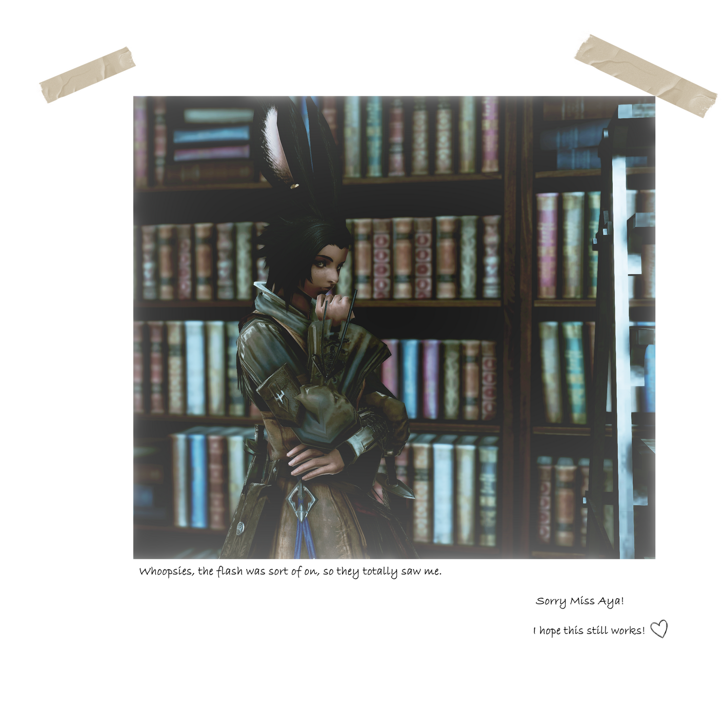 A few years ago, The Silver Spire made a curious discovery: one of our cottages was connected to a passageway to a secret library network underneath Ul'dah! Can you imagine! All the missed opportunities...This library, we thought to be a Belah'dian remnant. We found that it was guarded by a massive griffon - and a lone, eccentric Viera.While there are many 'unknowns' about this librarian of the underground, Petra actually appears to be an open book! They've simply been in the library for so many years that they don't remember much of their life from before it. Or so they say, I suppose.Nowadays, they are still the librarian, and work alongside the massive griffon guardian to caretake the ancient vaults and shelves. They're always happy for companionship, and allow free use of the library to anyone who is proven trustworthy.